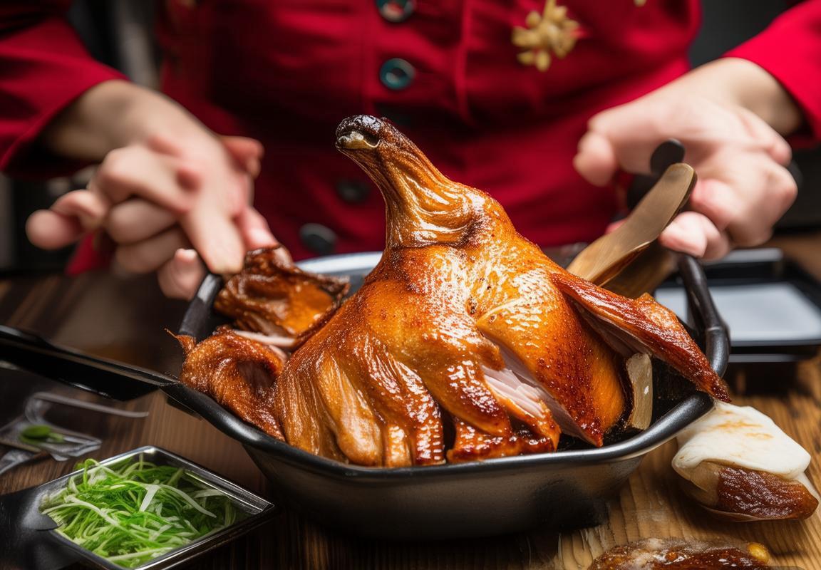 余霜手持金黄酥脆的烤鸭,向FLY队员展示传统片鸭技艺。她解释道,烤鸭选用优质填鸭,经果木熏烤而成,外皮酥脆、肉质鲜嫩。薄饼裹上鸭片,搭配甜面酱与葱丝,口感层次丰富。这道美食承载着北京数百年的饮食文化,曾是宫廷御膳,如今成为中外交流的桥梁。队员们惊叹于烤鸭的精湛工艺,迫不及待想要品尝。